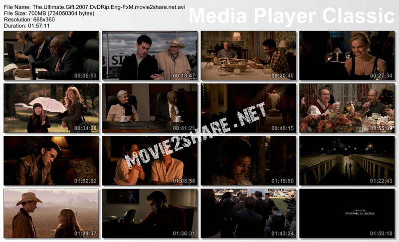 Jason thought his inheritance was going to be the gift of money and lots of it. Was he ever in for a big surprise. Based on the best-selling book "The Ultimate Gift" by Jim Stovall, the story sends trust fund baby Jason Stevens on an improbable journey of discovery, having to answer the ultimate question: "What is the relationship between wealth and happiness?" Jason had a very simple relationship with his impossibly wealthy Grandfather, Howard "Red" Stevens. He hated him. No heart-to-heart talks, no warm fuzzies, just cold hard cash. So of course he figured that when Red died, the whole "reading of the will" thing would be another simple cash transaction, that his Grandfather's money would allow him to continue living in the lifestyle to which he had become accustomed. But what Red left him was anything but simple. Red instead devised a plan for Jason to experience a crash course on life. Twelve tasks, which Red calls "gifts," each challenging Jason in an improbable way, the accumulation of which would change him forever.